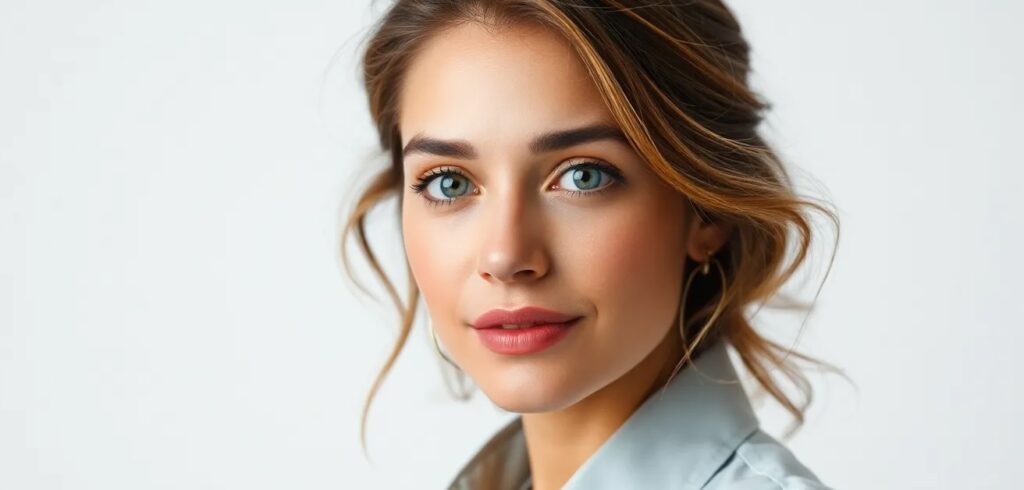ศิลปินหญิงชาวเอเชียวัย 28 ปี สวมเสื้อลินิน เอียงศีรษะเล็กน้อย สายตานุ่มลึกและครุ่นคิด ท่าทางผ่อนคลาย แสงแบบ Rembrandt มีสามเหลี่ยมแสงบนแก้ม เงานุ่ม ภาพถ่ายสมจริง โทนคลาสสิกเชิงศิลปะ