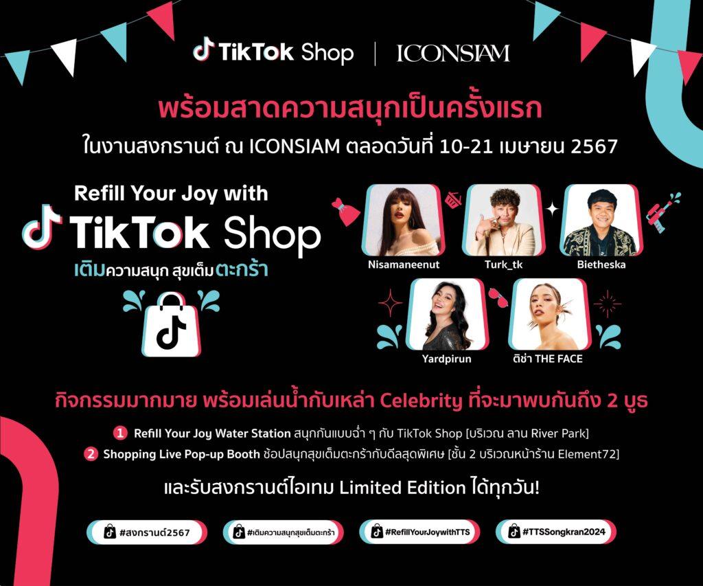 TikTok Shop โซลูชั่นอีคอมเมิร์ซชั้นนําในเอเชียตะวันออกเฉียงใต้ ร่วมมือกับ กรุงเทพมหานคร และ ไอคอนสยาม ฉลองเทศกาลแห่งความสุขของคนไทยและนักท่องเที่ยวจากทั่วโลก “Songkran 2024” ขึ้นเป็นมรดกภูมิปัญญาทางวัฒนธรรมที่จับต้องไม่ได้ของโลก จัดกิจกรรม Refill Your Joy with TikTok Shop เติมความสนุก สุขเต็มตะกร้า มอบประสบการณ์ Shoppertainment ส่งความสุขแบบ O2O Live Streaming ชวนเหล่าครีเอเตอร์ใน TikTok กว่า 100 ราย มาร่วม Live Commerce สนับสนุนสินค้าไทยมากมายทั้งสินค้า OTOP ใน TikTok Shop และสินค้าหัตถกรรมสร้างสรรค์ รวมถึงงานศิลป์ฝีมือคนไทยจาก ICONCRAFT มากกว่าร้อยประเภทสินค้า (SKUs) จากร้านค้านับสิบ ๆ ร้าน สร้างปรากฎการณ์ Shoppertainment ในแพลตฟอร์มตลอดเทศกาลมหาสงกรานต์ทั้งที่ ICONSIAM และสยามสแควร์
