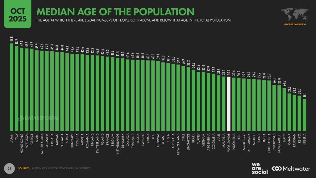 กราฟแสดงอายุเฉลี่ย (Median Age) ของประชากรในประเทศต่างๆ เป็นข้อมูลสำคัญที่สะท้อนถึงวุฒิภาวะทางเศรษฐกิจและสังคมของตลาดนั้นๆ โดย อายุเฉลี่ยของประชากรโลกอยู่ที่ 30.9 ปี (แสดงด้วยแท่งสีขาว) ซึ่งยืนยันว่าตลาดผู้บริโภคส่วนใหญ่ยังคงเป็น กลุ่มวัยหนุ่มสาวถึงวัยทำงานตอนต้น ตลาดโลกจึงยังขับเคลื่อนด้วยความต้องการด้านเทคโนโลยี การเริ่มต้นชีวิต และผลิตภัณฑ์ไลฟ์สไตล์ที่ทันสมัย