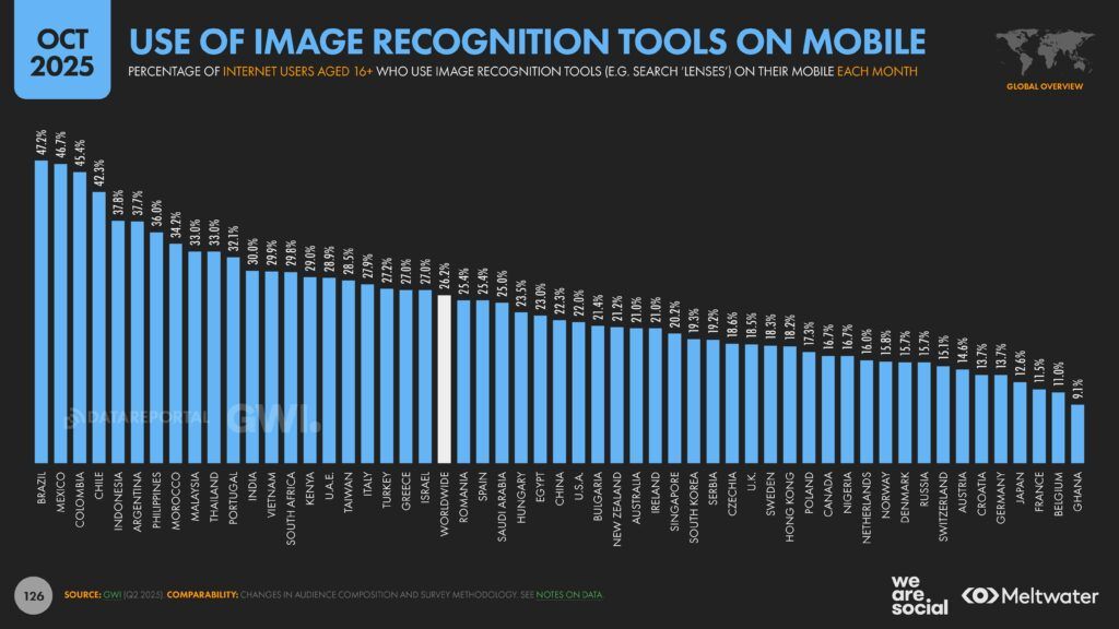 ข้อมูลเปอร์เซ็นต์ของผู้ใช้อินเทอร์เน็ตอายุ 16 ปีขึ้นไป ที่ใช้ เครื่องมือจดจำภาพ (Image Recognition Tools) บนโทรศัพท์มือถืออย่างน้อยเดือนละครั้ง แสดงให้เห็นว่า เทคโนโลยีนี้ถูกนำไปใช้มากในประเทศแถบละตินอเมริกาและเอเชีย โดยมีค่าเฉลี่ย ทั่วโลก (Worldwide) อยู่ที่ 26.2% และกลุ่มที่มี การใช้งานสูงสุด คือ บราซิล (47.2%) เม็กซิโก (46.7%) และ โคลอมเบีย (45.4%) ซึ่งเน้นย้ำถึงการเติบโตของการค้นหาด้วยภาพในกลุ่มประเทศเหล่านี้